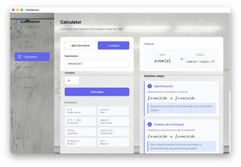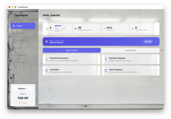 CalcMaster is a gamified desktop application designed to help students master derivatives and integrals. Practice with automatically generated problems, receive step-by-step solutions, and track your progress as you level up.